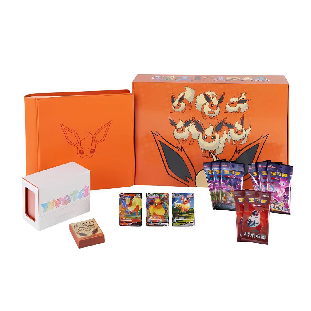 Wyjątkowy zestaw kolekcjonerski dedykowany fanom jednego z najpopularniejszych ewolucji Eevee – Flareona. Flareon VMAX Collection Box to bogato wyposażony box, który łączy w sobie ekskluzywne karty promo, dużą liczbę boosterów oraz praktyczne akcesoria do przechowywania kart.